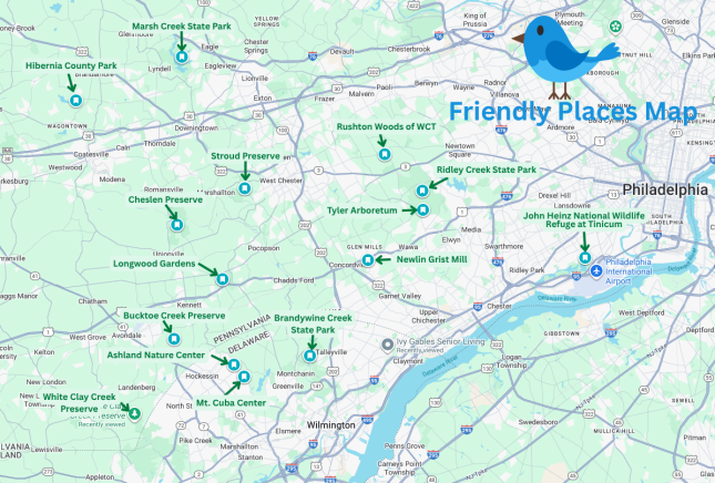 Below are a few local places (within 40 minutes of Glen Mills) that have natural areas that are great for enjoying nature and viewing the birds. We highly recommend exploring their respective websites before visiting to inform yourself of any admission fees and seasonal hours or closures.